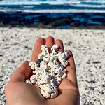 Yakındaki plajda şezlonglar, güneş şemsiyeleri bulunmaktadır.